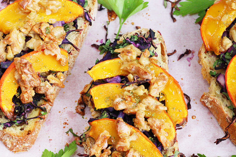 6. Brot in Scheiben schneiden, ca. 1,5 cm dick und mit etwas Margarine bestreichen. Nun mit einer großzügigen Schicht Rotkraut belegen, Kürbisspalten darauflegen und die marinierten Nüsse darüber verteilen. Kürbisspalten mit sehr wenig Olivenöl beträufeln oder mit Hilfe eines Backpinsels mit Öl benetzen.