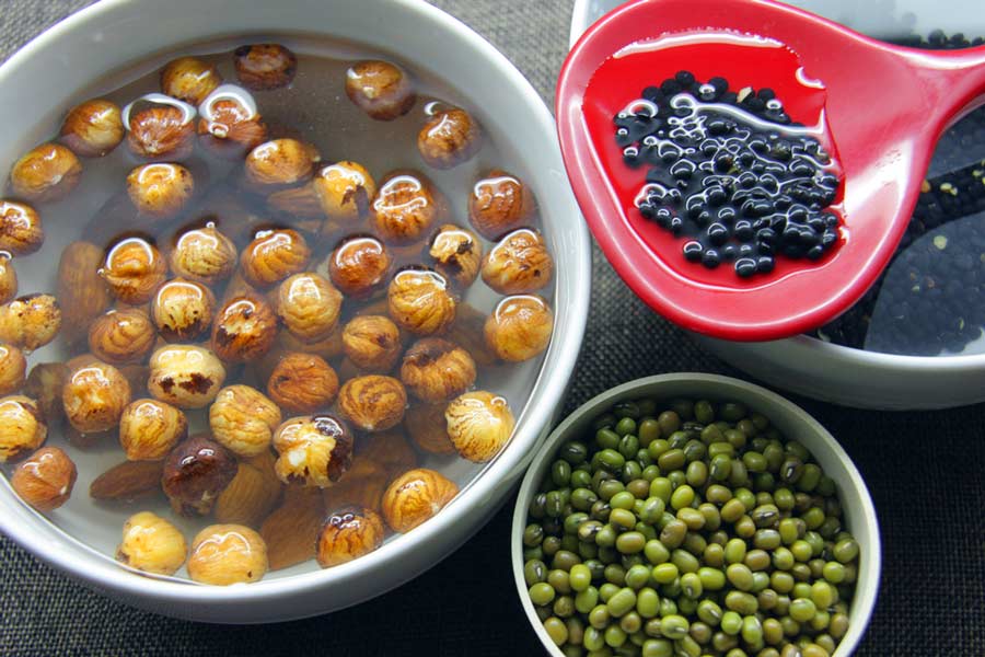 4. Die Einweichzeit der Nahrungsmittel befolgen und unterschiedliche Nüsse, Hülsenfrüchte und ebenso Getreidesorten in getrennten Schüsseln einweichen, weil sie unterschiedlicher Einweichzeiten bedürfen.