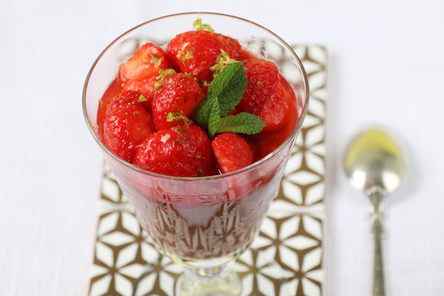 Haricots heißen Bohnen auf Französisch und dieses Mousse hat – Überraschung – Bohnen als Basis. Mein Rezept ist mit viel Minze, also eine gesunde Art von „After Eight“. Die Erdbeeren sind mit Ahornsirup, Minze und Limette mariniert, kommen ganz ohne herkömmlichen Zucker aus und schmecken himmlisch. Süß und erfrischend.